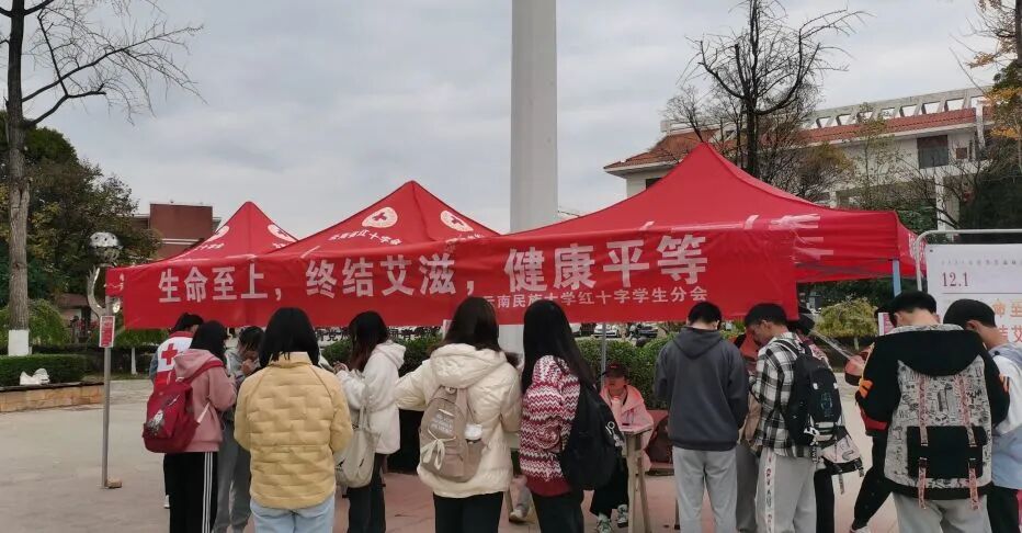 2021年12月1日是第34个"世界艾滋病日",当天云南民族大学红十字学生分会在雨花校区开展"同伴健康行,青春共防艾"活动,通过摆点宣传的方式吸引大量同学参与活动,活动内容主要包括∶"爱的抱抱"宣传防治艾滋病、发放宣传手册、扫码参与线上答题、赠送红丝带以及横幅征集签名等。活动形式丰富,调动了同学们参与活动的积极性。通过此次活动的开展,同学们表示,在活动中了解了更多预防艾滋病的知识,进一步提高了禁毒防艾的意识。
