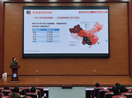 活动特邀重庆市血液中心献血招募科谢伶俐主管护师主讲。谢老师围绕艾滋病防治核心知识,结合真实案例讲解传播途径与常见误区,引导树立科学防艾观念,倡导关爱感染者、消除歧视。她还从专业角度阐明规范献血与疾病预防的关系,强调安全操作与严格筛查对保障用血安全的重要性,让同学们认识到无偿献血不仅是爱心奉献,更是公共卫生体系的重要一环。