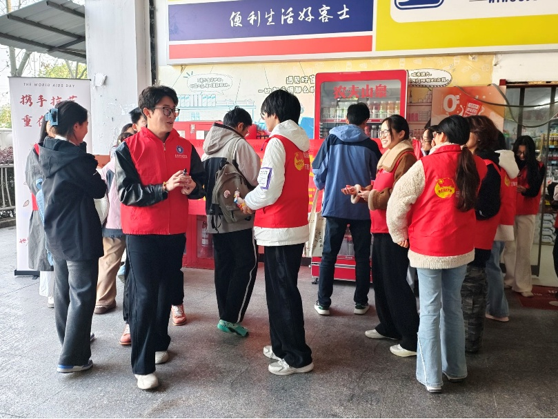 志愿者们向过往同学分发防护用品,让同学们了解艾滋病核心知识——明确性接触、血液、母婴三大传播途径,科普日常握手、共餐、蚊虫叮咬等不会传播的科学结论,让防护意识扎根心间,让科学认知驱散盲目恐慌。