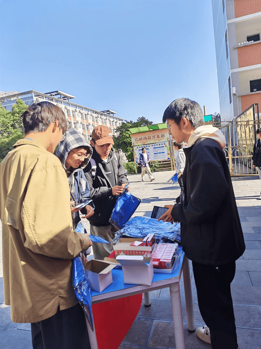 在“防艾抗艾下社区”环节,学冲校依托“一站式学生服务社区”,打造集宣传教育、实践体验于一体的实践基地。活动设置“防艾知识闯关”“‘艾’的抱抱”“爱心物资发放”三个互动区域,学生志愿者向社区同学发放避孕套、宣传卡片等物资2000余份,在发放过程中同步开展健康咨询服务。特别设计的“‘艾’的抱抱”环节,通过温暖的拥抱传递对艾滋病感染者的理解与支持,现场参与互动超500余人次。作为体验者之一的汪雪龙同学说:“真正拥抱后才发现,他们和我们没什么不同,这个拥抱让心里的隔阂一下子就没了。“这样的互动体验让防艾宣传更实在,也是学校实践育人的生动体现。